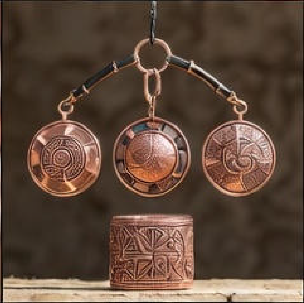 Torneado por don Pedro y luego bruñido con piedra de río hasta brillar como espejo. Los siete escalones simbolizan los niveles del Wenu Mapu. Se usa en machitunes reales y ahora también en altares domésticos.